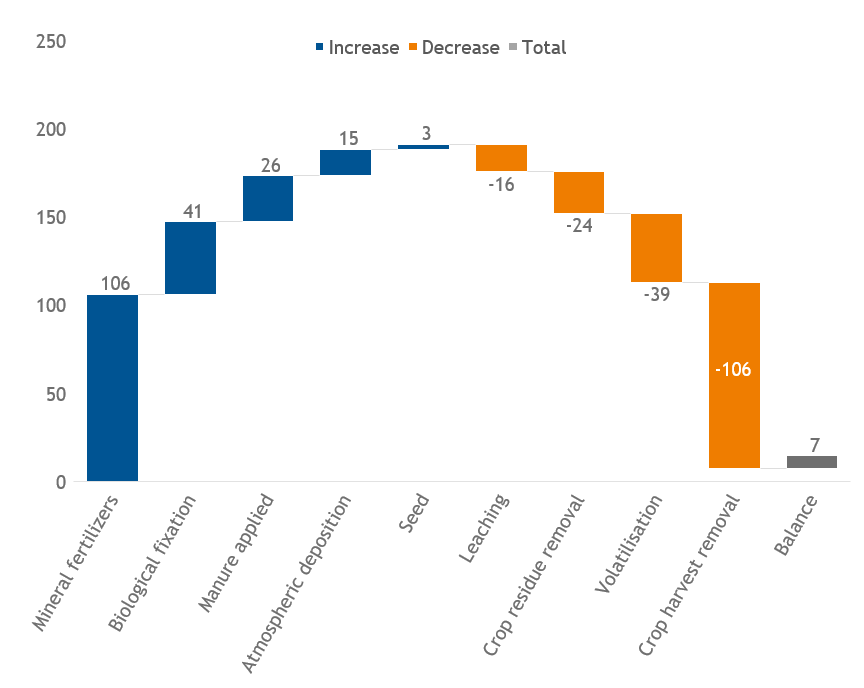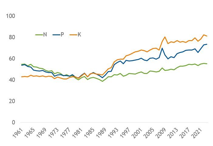 The database serves as a central knowledge bank for quantifying nutrient balances and nutrient use efficiency at national, regional and global levels, and as a foundation for vigilance on the impact of nutrient use on food production, climate, biodiversity, water and air quality.